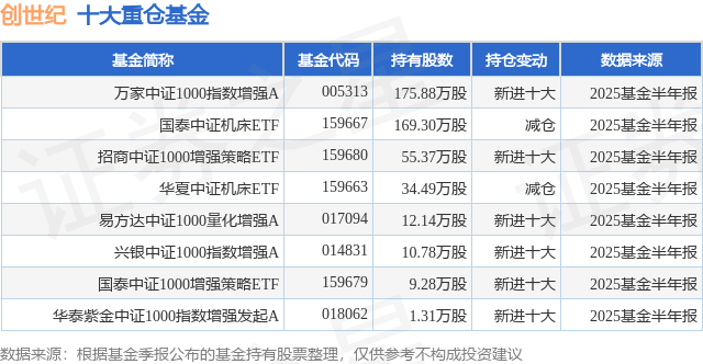 根据2025基金半年报公募基金重仓股数据,重仓该股的公募基金共8家,其中持有数量最多的公募基金为万家基金的万家中证1000指数增强A。万家中证1000指数增强A目前规模为11.08亿元,最新净值1.4704(10月13日),较上一交易日下跌0.35%,近一年上涨44.56%。该公募基金现任基金经理为乔亮。乔亮在任的基金产品包括:万家量化睿选混合A,管理时间为2019年8月21日至今,期间收益率为60.82%;万家沪深300指数增强A,管理时间为2019年9月6日至今,期间收益率为47.45%;万家中证500指数增强A,管理时间为2019年9月6日至今,期间收益率为106.33%。